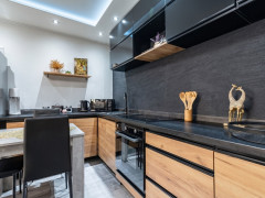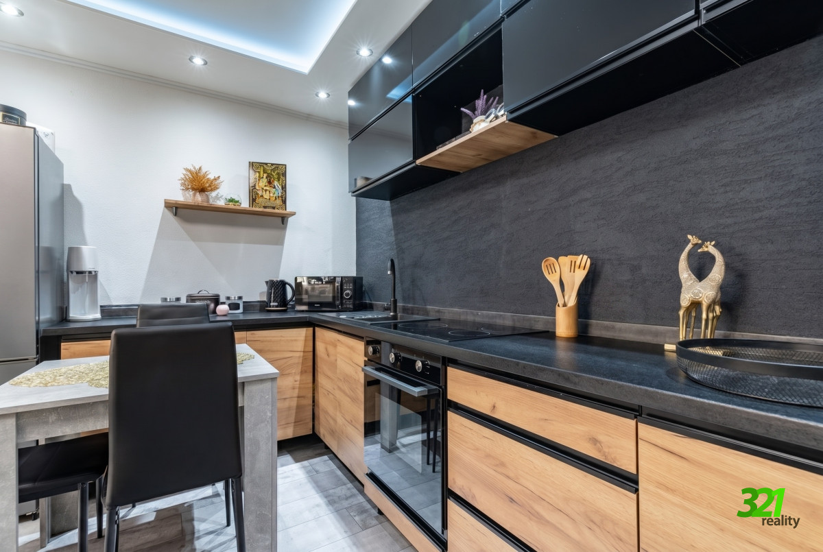 KUCHYŇSKÁ linka je vybavená spotrebičmi, výklopné vrchné skrinky, šuflíky, vybavenie kuchyne, špeciálne zapustený prívod vody a odpadu v podlahe, bez potreby schodíkových riešení, alebo čerpadla, čo ponúka komfort bez obmedzení.